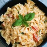 This Baked Feta Pasta recipe is a creamy, savory dish combining juicy roasted grape tomatoes and a golden block of baked feta cheese, tossed with bow tie pasta and fresh basil. Easy to prepare and packed with Mediterranean flavors, it’s perfect for a comforting weeknight dinner or a stylish meal to impress guests.