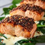 Delicious blackened salmon fillets stuffed with a creamy mixture of sautéed spinach, cream cheese, and Parmesan, creating a flavorful, wholesome meal perfect for a quick dinner. The salmon is seasoned with a smoky spice blend, seared to create a blackened crust, then finished in the oven for tender, flaky perfection.