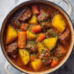 This Classic Beef Stew is a hearty, flavorful dish perfect for comforting meals. Tender chunks of beef are coated in a seasoned flour mixture, seared to develop a rich crust, then slowly braised with aromatic vegetables, red wine, and savory herbs. The stew simmers for hours until the meat becomes fork-tender and the potatoes and carrots are perfectly cooked, resulting in a warm, satisfying dish ideal for family dinners or special occasions.