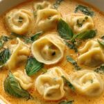 This Easy Thai Red Curry Dumpling Soup is a comforting and flavorful dish combining the spicy richness of Thai red curry with tender dumplings in a creamy coconut broth. Quick to prepare and perfect for weeknight dinners, this soup features sautéed vegetables, fragrant aromatics, and vibrant greens, garnished with fresh cilantro, green onions, and a squeeze of lime for added zest.