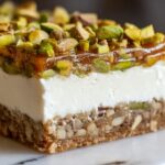 Once your cheesecake has cooled completely, mix 1 cup of honey with 1 tablespoon lemon juice and a splash of rosewater. This magical mixture is what elevates this dish into a showstopper. Pour it generously over the top, letting it soak slightly into the cheesecake. Finish by sprinkling the coarsely chopped pistachios to add a stunning visual contrast and satisfyingly fresh crunch. Your Honey Pistachio Baklava Cheesecake Recipe is now ready to impress.