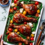 Green beans, bell peppers, onions, and cherry tomatoes are perfect choices because they roast well and complement the glaze without overwhelming the chicken.