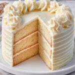 A little goes a long way when garnishing this cake. Fresh mint leaves, edible flowers, or a light dusting of powdered sugar can add a charming touch without overwhelming the cake’s delicate flavor. A handful of fresh berries around the base also contrasts beautifully with the smooth, white frosting for a pop of color and freshness.