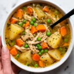 The stew will have a moderately thick, comforting broth thanks to the flour coating on the chicken. If you want a thicker stew, you can mash some of the cooked potatoes in the broth or add a cornstarch slurry during the last 15 minutes of cooking.