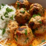 These Spiced Chicken Meatballs in Coconut Curry deliver a flavorful and comforting meal featuring tender chicken meatballs simmered in a rich, aromatic coconut curry sauce. Perfect for a weeknight dinner, this recipe combines warm spices like cumin, coriander, and turmeric with the creaminess of coconut milk, garnished with fresh cilantro and brightened with lime wedges.