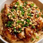 This Spicy Kung Pao Chicken Noodles recipe combines tender chicken breast pieces with savory and spicy sauce served over your choice of noodles. The dish features a flavorful balance of tamari, chili paste, peanut butter, and toasted sesame oil, garnished with crushed peanuts and green onions for added texture and taste. Ready in just 30 minutes, it’s a perfect quick and delicious meal for four servings.
