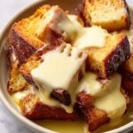 Once the bread pudding has reached that beautiful golden hue and the custard is set, serve it warm with generous drizzles of the homemade vanilla sauce on top. The contrast of warm pudding and creamy sauce creates comfort in its purest form.