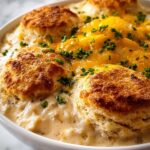The Cheesy Chicken Biscuit Casserole is a comforting and easy-to-make baked dish featuring shredded chicken, creamy cheese sauce, and fluffy biscuit dough, baked to golden perfection. Ideal for a family-friendly dinner, this casserole combines savory flavors with a crispy, buttery topping.