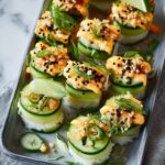 After baking, let it cool slightly. Then generously scatter diced avocado, cucumber, crumbled nori, and sliced green onions on top. The fresh veggies add brightness and texture contrasts that brighten each bite.
