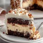 This White German Chocolate Cake with a Creamy Cheesecake Center combines the light, fluffy texture of a white cake with the rich, smooth delight of a classic cheesecake. Finished with a luscious buttercream frosting and garnished with shredded coconut and chopped pecans, this cake offers a decadent twist perfect for special occasions or indulgent dessert cravings.