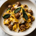 2. Cook Pasta and Fry Sage: Bring a large pot of salted water to a boil. Add the pasta and cook until al dente according to package instructions. Drain the pasta, reserving some pasta water for later. Meanwhile, in the same skillet used for the meatballs, heat olive oil over medium heat and fry the fresh sage leaves until they become crispy. Remove and set aside for garnish.